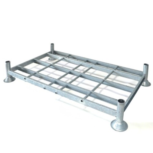 Cette palette métallique entièrement galvanisée et gerbable est prévue pour un stockage modulaire des palettes.